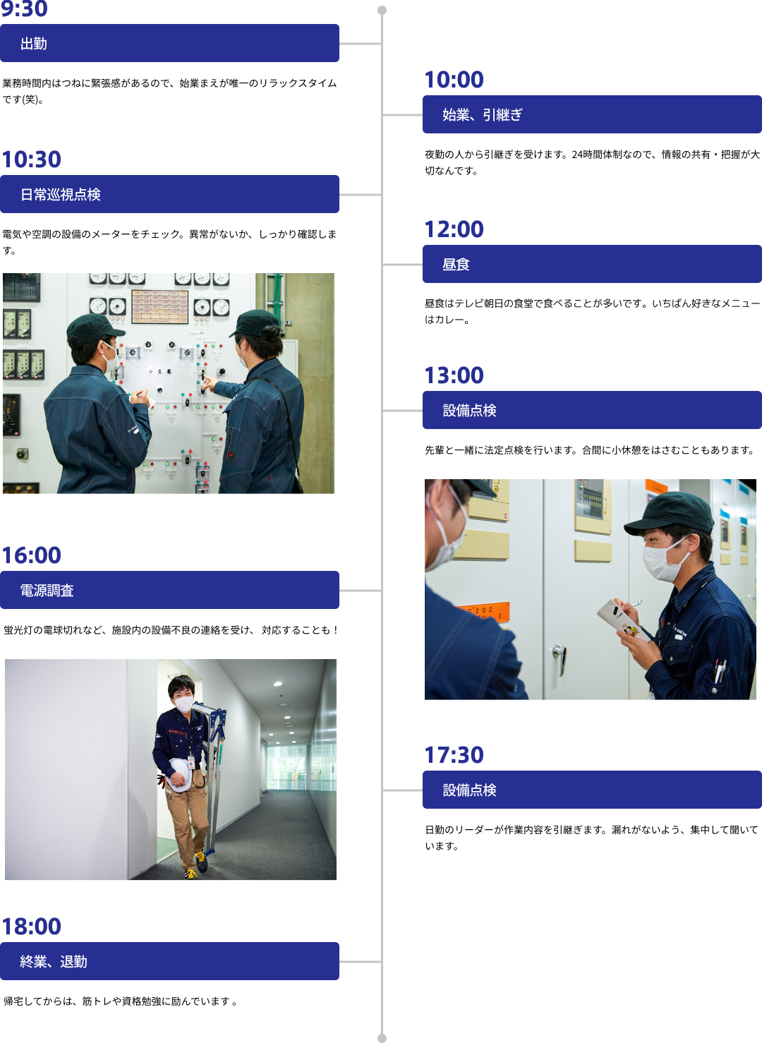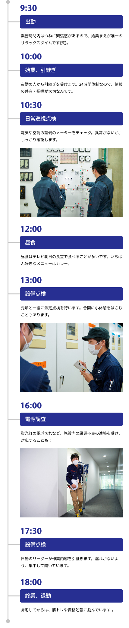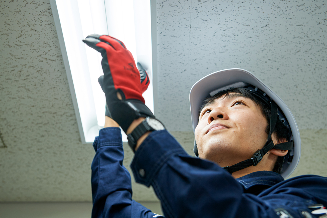 業務内容は、電気や空調の設備を確認する日常巡視、施設の不具合が起きたときの電話対応や小修繕、各設備の定期点検などの通常業務がメインです。まだ、わからない部分も多いので、常に先輩について作業を行っています。心掛けているのは、現場でわからないことをそのままにしないこと。質問するときも、どういう成り立ちでその作業が必要なのかを積極的に聞いて、手順だけではなく流れも含めてしっかり理解するようにしています。
